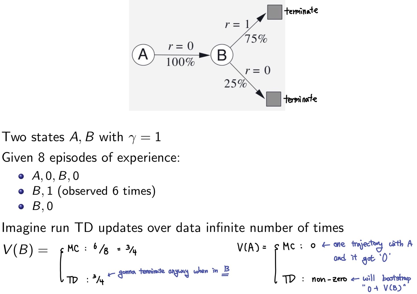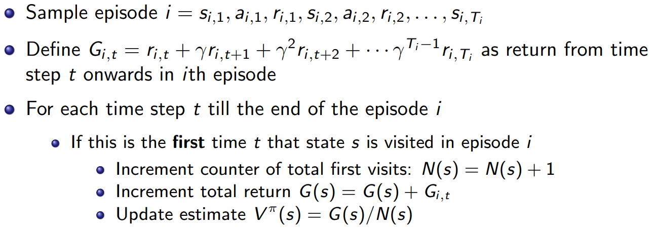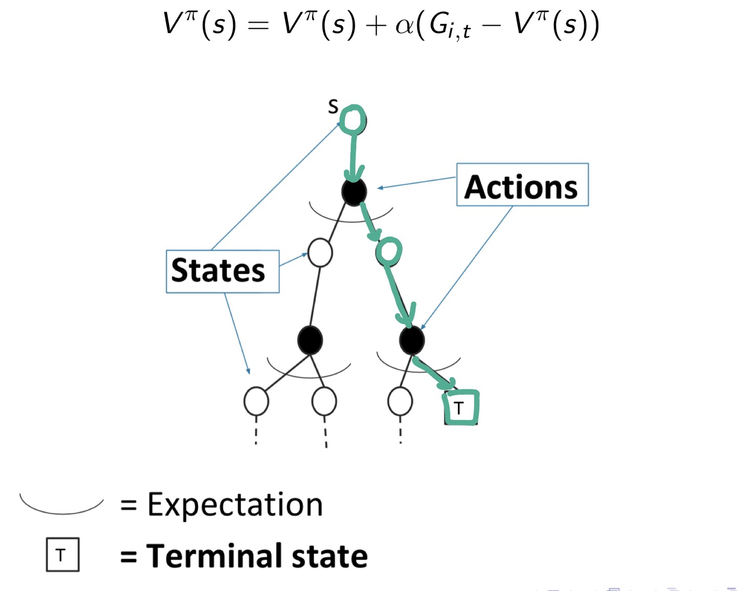 - by law of large numbers, as $N(s)$→$\infin$, $V^\pi(s)$ converges to $E_\pi[G_t|s_t=s]$ “consistent”