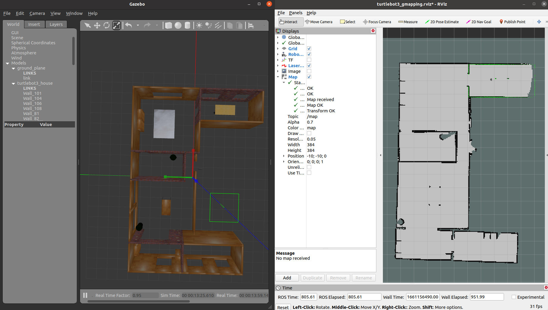 튜토리얼은 여기까지지만 심심하므로 house map도 mapping 해보기로 한다. 복잡한 그래픽으로 인해 gazebo가 켜지는데 오래 걸린다.